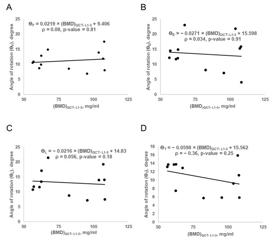 Correlation plot between ROM parameters and QCT BMD: (A)—flexion angle of rotation (ϴF) vs. QCT BMD; (B)—extension angle of rotation (ϴE) vs. QCT BMD; (C)—lateral bending angle (ϴL) vs. QCT BMD; (D)—twisting angle of rotation (ϴT) vs. QCT BMD, ρ—Spearman correlation coefficient.