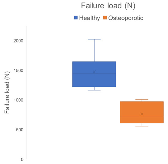 Box plot showing the distribution of failure load values for healthy and osteoporotic lumbar spine models.