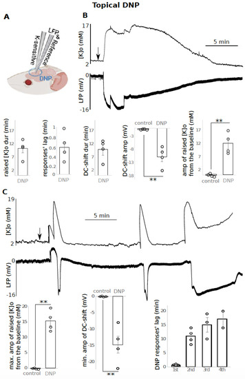 DNP topical application resulted in raised [K]o and negative DC-shifts. (A) Experimental configuration for B and C experiments; (B) top: a single prolonged raised [K]o and DC-shift (n = 4), bottom: data presentation; (C) another type of response after DNP application: top: recurrent peaks in [K]o and dips in the LFP, bottom: data presentation (n = 4), only maximum (max.) of raised [K]o and minimum (min.) of DC-shift amplitude (amp) were included in the average calculation, 2 to 4 recurrent responses occurred per animal. The time between drug application till appearance of each of the recurrent responses is reported as “responses’ lag. Raised [K]o amplitude was calculated by subtracting the peak from the baseline [K]o such that the reported value is the difference. ** indicates significance (p < 0.01). dur = duration, amp = amplitude, min = minutes, max. = maximum, min. = minimum. Circle presents individual data.