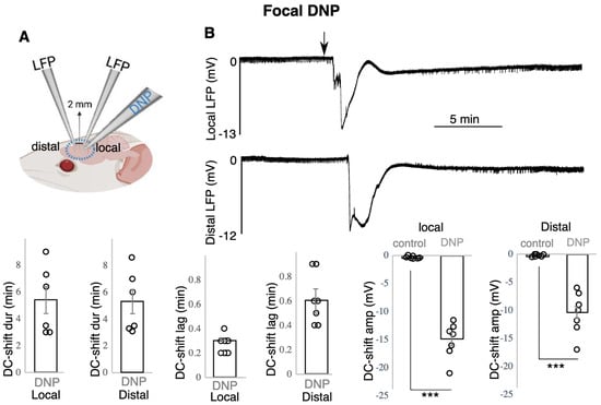 DNP focal application resulted in spreading negative DC-shifts. (A) Experimental configuration, (B) top: DC-shift spreading from local to distal site following focal application of DNP, bottom: data presentation (n = 7). *** indicates significance (p < 0.001), dur = duration, amp = amplitude, min = minutes. Circle presents individual data.