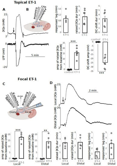 After a time of 1.0 +/− 0.2 min post topical application of 1 μM ET-1, [K]o increased by 15.9 +/− 1.8 mM (p < 0.001) from the baseline [K]o which lasted for 3.7 +/− 0.6 min. This increase was companied by a DC-shift with an amplitude of −24.4 +/− 2.6 mV (p < 0.001) lasting for 3.1 +/− 0.6 min (Figure 3A, n = 7). Next, to confirm the spread of the K response from a local to a distal site—which is a necessary component of SD—we focally injected ET-1 closer to one of the recording electrodes (local site) and recorded the response both locally and 4 mm away from the injection site (distal site) (Figure 3C). In the local site, 1.1 +/− 0.3 min (responses’ lag) after ET-1 focal application, [K]o increased to 17.6 +/− 1.7 mM from the baseline which lasted for 3.0 +/− 0.4 min (Figure 2D, n = 5). In the distal site, 2.3 +/− 0.5 min after ET-1 focal application, the [K]o increased to 14.0 +/− 2.2 mM which lasted for 3.1 +/− 0.5 min (Figure 3D).