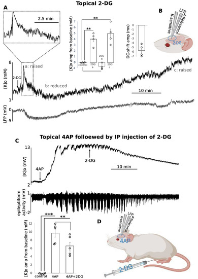 Changes in resting and 4AP-evoked [K]o following 2-DG application. (A) Topical application of 2-DG led to an initial increase (a) followed by a slight reduction (b) and then a long and slow increase (c) in the [K]o, and a small DC-shift in LFP was also detected early in the response (n = 4); (B) experimental configuration; (C) 4AP-evoked raised [K]o (top) and epileptiform activity (bottom) before and after and 2-DG (n = 5); (D) experimental configuration. ** (p < 0.01), *** (p < 0.001) indicates significance, dur = duration, amp = amplitude, min = minutes. Circle presents individual data.