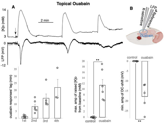 Ouabain led to raised [K]o and DC-shifts. (A) Recurrent peaks in [K]o and dips in LFP shown on top and the data shown in the bottom (n = 6), only max. of the raised [K]o and min. of the DC-shift amplitude was included in the average calculation, two to four recurrent responses occurred per animal: the time between drug application till appearance of each of the recurrent responses is reported as “responses’ lag”. Raised [K]o amplitude was calculated by subtracting the peak from the baseline [K]o such that the reported value is the difference. (B) experimental configuration. ** indicates significance (p < 0.01), amp = amplitude, min = minutes, max. = maximum, min. = minimum. Circle presents individual data.