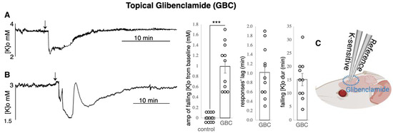 After 1.0 +/− 0.2 min post topical application of 5 μM Glibenclamide (responses’ lag), the [K]o amplitude decreased by 1.0 +/− 0.1 mM (p < 0.001) as measured in 11 animals (Figure 6A,B). The [K]o came back to baseline after 15.2 +/− 2.3 min. In 6 of the 11 animals, the decreased [K]o recovered (one to three times) transiently (attempted to reach the baseline level but failed to remain there) (Figure 6B). The other five animals presented a smooth fall and recovery of [K]o (Figure 6A). The deepest point of the falling [K]o was used to calculate the average for 11 animals.