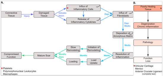 After skeletal maturity, injury to load bearing connective tissues, such as some ligaments, tendons and menisci can lead to the host attempting to initiate repair using the wound healing apparatus, or a failure to initiate such a response as in the case of complete rupture of the anterior cruciate ligament (ACL) of the knee, or after generation of a defect in articular cartilage. In the case of the ruptured ACL, the two ends of the ligament cannot find each other and thus a reconstruction with an autologous tissue section of a tendon [40,41] or an allogeneic tissue is required. In this circumstance, the reconstruction operation is another inflammatory stimulus with additional tissue damage due to the drilling of bone and cutting to gain access to the interior of the joint. In the case of articular cartilage defects due to the lack of innervation and a microvasculature, they are believed to contribute to a lack of healing unless some interventions are initiated, discussed in [42].