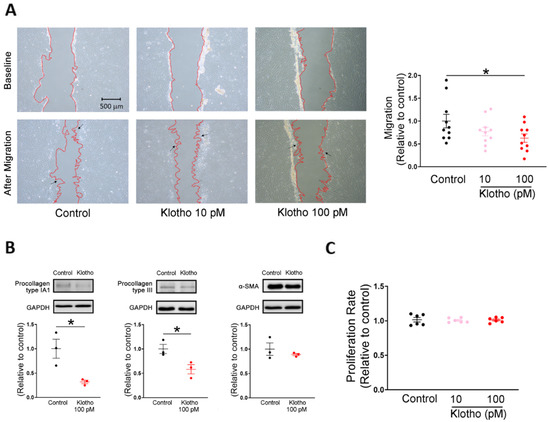 Compared with control human atrial fibroblasts, a high dose of Klotho (100 pM)-treated atrial fibroblasts exhibited lesser migratory capability and lower expression of procollagen type IA1 and procollagen type III (Figure 1A,B). However, control and Klotho (100 pM)-treated atrial fibroblasts had similar expression of α-SMA. In contrast, control and Klotho-treated (10 and 100 pM) human atrial fibroblasts had similar proliferation rates (Figure 1C).