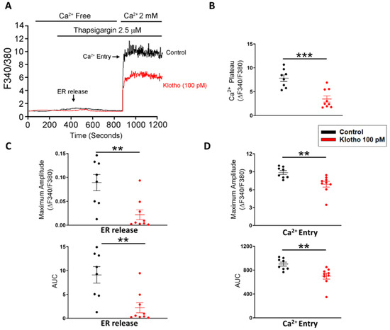 Store-operated Ca2+ entry (SOCE) in human atrial fibroblasts with and without Klotho (100 pM). Representative tracings (A), average data of the Ca2+ plateaus (B), the endoplasmic reticulum (ER) release (C) and Ca2+ entry (D) in Fura-2 AM-loaded human atrial fibroblasts. Klotho (100 pM, 48 h)-treated fibroblasts (n = 8–9 from 4 independent experiments) had a lower ER release and a lower Ca2+ entry than control fibroblasts (n = 8 from 3 independent experiments). ER, endoplasmic reticulum. ** p < 0.01, *** p < 0.005.