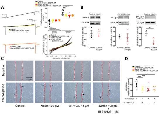 Since store-operated Ca2+ entry (SOCE) plays an essential role in the cellular calcium signaling and modulates cell migration [23], we measured the intracellular calcium imaging and compared the difference in SOCE between fibroblasts with and without treatment of Klotho. Klotho-treated (100 pM) human atrial fibroblasts exhibited a lower ER calcium release and a lower store-operated Ca2+ entry (SOCE) than control fibroblasts (Figure 2). Since TRP channels critically control the Ca2+ influx and regulate the cardiac fibroblast function [24], we examined whether Klotho may modulate the TRP current. In this experiment, Klotho-treated (100 pM) human atrial fibroblasts had lower TRP currents than control fibroblasts (Figure 3A). Because previous studies demonstrated that Klotho inhibited the PLC signaling [25] and PLC modulates TRP channels and SOCE [26,27,28], we also performed Western blots to examine the effect of Klotho on PLC signaling. As shown in Figure 3B, Klotho-treated (100 pM) human atrial fibroblasts had similar expression of total PLCβ3 but less expression of pPLCβ3 Ser537 than control fibroblasts. TRPC6 channels have been shown to modulate fibroblast function and promote fibrosis [18,29]. Accordingly, we evaluated the role of TRPC6 in human atrial fibroblasts and found that BI-749327 (a selective TRPC6 inhibitor, 1 μM)-treated fibroblasts had smaller TRP currents than control fibroblasts. However, in the presence of Klotho (100 pM), fibroblasts with and without treatment of BI-749327 had similar TRP currents, which were smaller than control fibroblasts (Figure 3A). Moreover, Western blots showed that Klotho (100 pM)-treated and control fibroblasts had a similar expression of TRPC6 (Figure 3B). These findings suggest that Klotho might modulate TRPC6 function, leading to reduced atrial fibroblasts migration. We performed the migratory capability test of fibroblasts and found that Klotho (100 pM)-treated fibroblasts, BI-749327 (1 μM)-treated fibroblasts, and combined Klotho (100 pM) and BI-749327 (1 μM)-treated fibroblasts had lower migratory capability than control fibroblasts with a similar extent (Figure 3C,D).