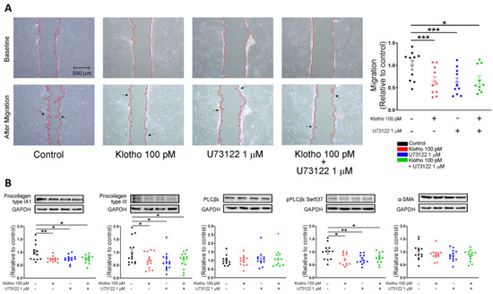 As shown in Figure 4A, Klotho (100 pM)-treated fibroblasts, PLC inhibitor (U73122, 1 μM)-treated fibroblasts, and combined Klotho (100 pM) and PLC inhibitor (1 μM)-treated fibroblasts had lower migratory capability than control fibroblasts similarly. Western blots showed that Klotho (100 pM)-treated fibroblasts, PLC inhibitor (U73122, 1 μM)-treated fibroblasts, and combined Klotho (100 pM) and PLC inhibitor (1 μM)-treated fibroblasts had lower expression of procollagen IA1, procollagen III, and pPLCβ3 Ser 537 than the control. However, the expressions of α-SMA and total PLCβ3 were similar in the four groups (Figure 4B).