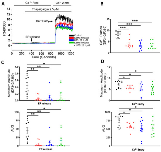 SOCE in human atrial fibroblasts in 4 different groups (control; Klotho 100 pM, 48 h; U73122 1 μM, 48 h; Klotho 100 pM plus U73122 1 μM, 48 h). Representative tracings (A) and average data of the Ca2+ plateaus (B), the ER release (C), and the maximum amplitude of the Ca2+ entry (D) in Fura-2 AM-loaded human atrial fibroblasts (n = 9–11 from 4 independent experiments). Human atrial fibroblasts in the control group had a higher ER release and a higher Ca2+ entry than the other 3 groups. * p < 0.05, ** p < 0.01, *** p < 0.005.