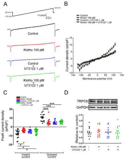 - Xie, J.; Cha, S.K.; An, S.W.; Kuro, O.M.; Birnbaumer, L.; Huang, C.L. Cardioprotection by klotho through downregulation of trpc6 channels in the mouse heart. Nat. Commun. 2012, 3, 1238. [Google Scholar] [CrossRef] [Green Version]
