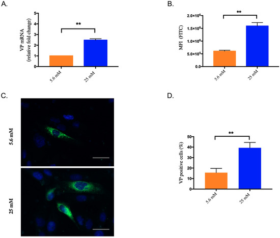 The recombinant plasmids (rVPwt and rVPmut) and siRNA-VP were designed as previously described [17,30], respectively, and verified by sequencing (Genecust, Luxembourg). Cells grown in 24-well plates were transfected with recombinant plasmids or siRNA-VP for a 24 h period. Transfections were performed with Lipofectamine 3000 and Lipofectamine RNAiMAX (Invitrogen, Carlsbad, CA, USA) according to the manufacturer’s instructions.