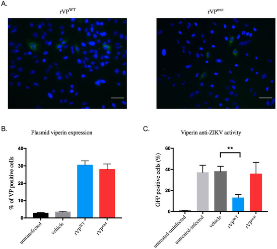 Anti-Zika virus activity of recombinant viperin in HK-2NGC cells. Expression of recombinant wild-type viperin (rVPwt) and recombinant mutant viperin (rVPmut) proteins in HK-2NGC cells detected by immunofluorescence assay (A) and flow cytometry (B). Viperin (green) and nuclei (blue) were visualized by fluorescence microscopy. (C) Anti-ZIKV activity of rVPWT in HK-2NGC cells. HK-2 cells were infected with ZIKVGFP and GFP-positive cells were quantified by flow cytometry at 24 h post-infection. Results are shown as means ± SD. Unpaired t-test shows that differences are statistically significant (** p < 0.01). Scale bars represent 100 µm.