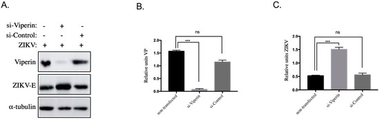Overexpression of endogenous viperin in HK-2HGC cells suppresses ZIKV infection. (A) HK-2HGC cells were transfected with siRNA-VP (si-Viperin) or scrambled siRNA (si-Control) for 24 h and then infected with ZIKVGFP at a MOI of 1 for another 24 h. Immunoblots show viperin (VP) and ZIKV-E proteins, as well as α-tubulin as loading control. Viperin protein and ZIKV-E quantification in (B,C), respectively, were performed by normalizing to tubulin from the results obtained in (A). Data are representative of at least three independent experiments. Results are shown as means ± SD. Unpaired t-test shows that differences are either non-significant (ns) or statistically significant (*** p < 0.001).