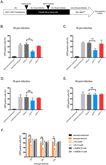 To test this hypothesis, we transferred supernatants of rVPwt or rVPmut transfected HK-2 cells on naive HK-2NGC cells at different time points pre- and post-infection and monitored ZIKVGFP infection by flow cytometry 24 h post-infection (Figure 4A). Interestingly, we observed a significant inhibition (54%) of ZIKV infection in HK-2 cells when treated with supernatants of cells transfected with rVPwt plasmid at 6 h pre-infection (Figure 4B) compared to cells treated with supernatants of non-transfected (vehicle) or rVPmut transfected cells. The reduction in ZIKV infection was still significant (52%) up to 2 h pre-infection (Figure 4C). In contrast, when added 2 h post-infection, supernatants from rVPwt transfected HK-2 cells had only a moderate and not significant antiviral effect (Figure 4D), and this ZIKV inhibiting effect was completely lost 6 h after infection (Figure 4E).