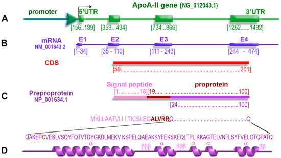 - Knott, T.J.; Wallis, S.C.; Robertson, M.E.; Priestley, L.M.; Urdea, M.; Rall, L.B.; Scott, J. The human apolipoprotein AII gene: Structural organization and sites of expression. Nucleic Acids Res. 1985, 13, 6387–6398. [Google Scholar] [CrossRef] [PubMed][Green Version]