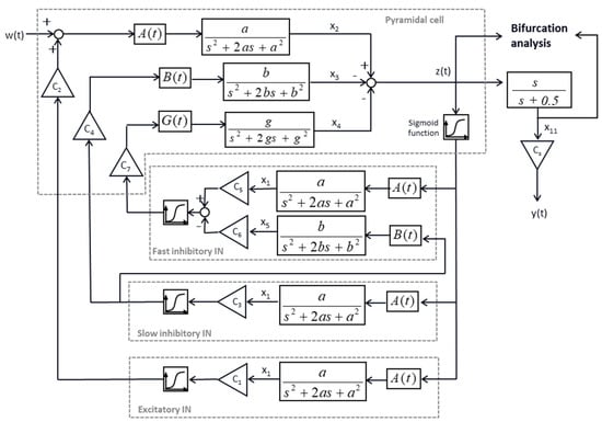 where Ci, i = 1 to 7, and CS, a, b, g, and G are constants, and their values are listed in Table A1 of Appendix B. A and B are parameters that are adjusted to generate normal and epileptic EEGs. The right-most transfer function, s/(s + 0.5), is a high pass filter which emulates the signal processing of an EEG recorder. The output, y, is the simulated EEG.