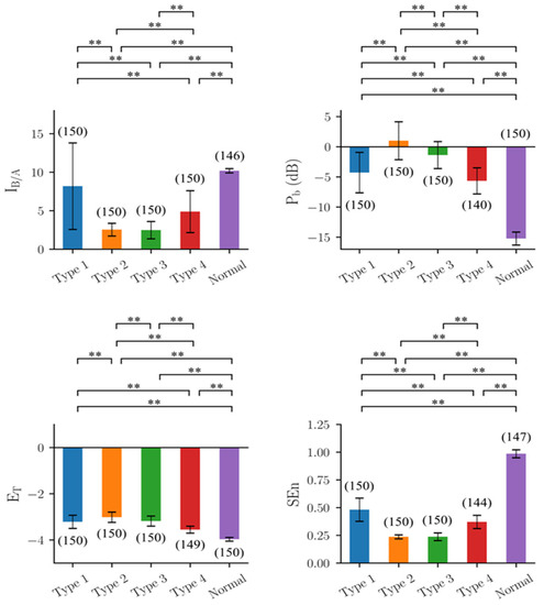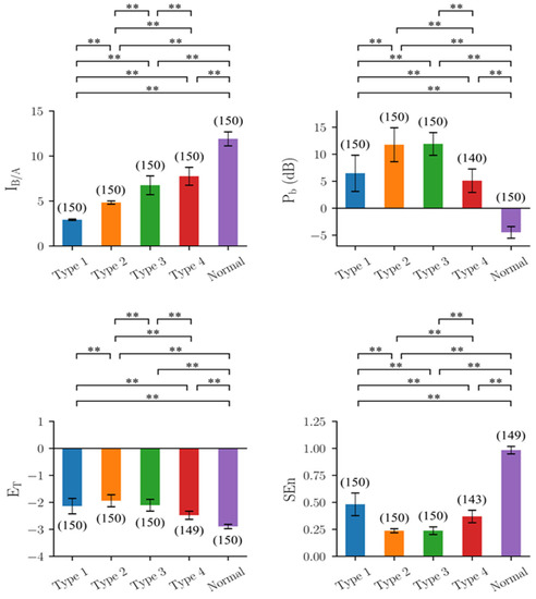 Results of the four indicators on the EEG segments produced by the mathematical seizure model, y(t). IB/A: estimated B/A from CSCKF, Pb: band power in the frequency range of 4–50 Hz, ET: Teager energy operator, and SEn: sample entropy. The colored bar shows the mean value for each group, and the error bar shows the corresponding range of ±1 standard deviation. The number within the parentheses is the number of EEG segments, where the outliers have been excluded through the 1.5 inter-quartile range rule. **: Significant difference (p-value < 0.01) tested by multiple comparisons using non-parametric Mann–Whitney U tests with Bonferroni corrections with α = 0.01.