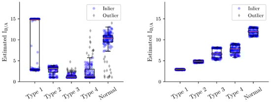 Scatter plots of IB/A for y(t) (left plot) and z(t) (right plot), corresponding to the left upper plots of Figure 2 and Figure 3, respectively. In the case of z(t), the trend of estimates was consistent with the setting, i.e., graded increase of IB/A from Type 1 EEGs to normal EEGs. In addition, three bands, corresponding to three values of A (Figure A1), can be seen. The boxplot for each group has a standard form, displaying the inter-quartile range (box), the range of inliers (error bar), and the median (orange line).