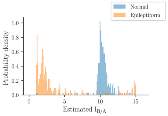 The estimated IB/A values of experimental EEG data without electrical stimulation are shown in Figure 5. It is clear that most of the normal EEGs were estimated to have a larger IB/A value of around 10, while most of the epileptiform EEGs were estimated to have a lower IB/A value of around 3. However, some epileptiform EEGs had higher IB/A values than those of normal EEGs. In addition, the normal and epileptiform EEGs were segregated into two groups, and there were only a small number of intermediate points between these two peaks, indicating a trend of dichotomy. In other words, IB/A could distinguish between normal and epileptiform discharges, but could not quantify their severity. This phenomenon, i.e., split of estimates to two ends in Type 1 EEGs, was also similar to those seen in simulated EEGs (Figure 2 and Figure 4).