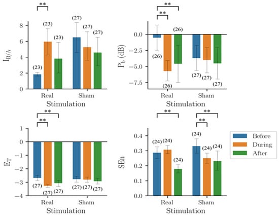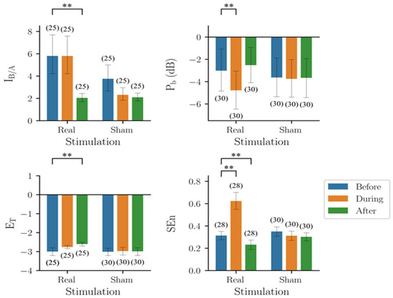 The group results (mean ± standard deviation) of Pb before, during, and after real stimulation were −3.02 ± 5.09, −4.78 ± 4.79, and −2.52 ± 4.39, respectively. Two-way mixed design ANOVA showed that time was a significant factor (F2,116 = 5.488, p = 0.005), but treatment was not (F1,58 = 0.043, p = 0.837), and there was a significant interaction between the effects of the two factors (F2,116 = 4.523, p = 0.013). The group results of ET before, during, and after real stimulation were −2.99 ± 0.53, −2.76 ± 0.21, and −2.61 ± 0.24, respectively. Two-way mixed design ANOVA revealed that time was a significant factor (F2,106 = 10.581, p < 0.0001), but treatment was not (F1,53 = 2.83, p = 0.098), and there was a significant interaction between the effects of the two factors (F2,106 = 9.482, p < 0.001). The group results of SEn before, during, and after real stimulation were 0.33 ± 0.12, 0.62 ± 0.21, and 0.23 ± 0.12, respectively. Two-way mixed design ANOVA showed that both time (F2,112 = 49.51, p < 0.001) and treatment (F1,56 = 6.12, p = 0.016) were significant factors, and that there was a significant interaction between the effects of the two factors (F2,112 = 56.55, p < 0.001).