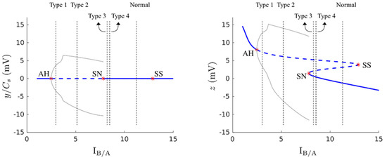 Because the results of the performance indicators were inconsistent, we investigated this issue using simulated data. Three sets of one normal and four types of epileptic activities were generated using a seizure model to evaluate the performance indicators, and the results of bifurcation analysis offered an explanation for the discrepancy in indicator performance when using different outputs (Figure 8, right plot). Within the range between the saddle-node (SN, at B/A = 7.824) and saddle-saddle (SS, at B/A = 12.897) bifurcation points, the dynamics of the epilepsy model had one stable and two unstable fixed points, while it had only either one stable or unstable fixed point outside this range. The dynamics underwent supercritical Andronov–Hopf (AH) bifurcation (negative Lyapunov number) at B/A = 2.478 as IB/A increased from below, and then a limit cycle persisted until B/A reached the SN bifurcation point. As shown, the Type II epileptiform activity generated by the epilepsy model corresponded to the dynamics of limit cycles with small amplitudes, and the Type III epileptiform activity was generated by large-amplitude limit cycle dynamics. The irregular Type IV and clustered Type V epileptiform activities appeared when B/A was slightly larger than the SN bifurcation point. The irregular or clustered large spikes in Type IV and Type V epileptiform activities originated from the limit cycle behavior due to escape from the attraction domain of the stable fixed point (lower solid line) in the presence of noise in the model input to the unstable fixed point region (upper dashed lines). Normal activity was generated when B/A was sufficiently far away from the SN bifurcation point, so that the input noise was hardly able to lift z(t) to the unstable region.