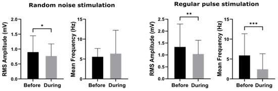 The group amplitude and mean frequency of EEGs before and during the two stimulation protocols, respectively. Significant difference (p-value *: < 0.05, **: < 0.01 and ***: < 0.001) was tested by using non-parametric Wilcoxon signed-rank tests.