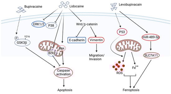 Lidocaine, also known as lignocaine, is an amide local or regional anesthetic, usually used for superficial and invasive procedures. The anesthetic action of lidocaine and its similar drugs blocks the sodium channel activity. Therefore, the neurons of the local tissues are not capable of sending a response to the CNS [68]. Besides anesthesia, this type of local anesthetic drug shows a potential off-target cytotoxic effect [69,70], which this cytotoxic effect may be an additional molecular event for anti-cancer therapy. Early study has indicated that bupivacaine, a long-acting local anesthetic, can induce apoptosis of both ovarian and prostate cancer cells. Xuan et al. have discovered that treatment of bupivacaine induces phosphorylation at tyrosine 216 residue of glycogen synthase kinase 3 beta (GSK3β). This bupivacaine-induced phosphorylation of GSK3β promotes activation of both caspase 8 and 9 in ovarian cancer cells, whereas only caspase 8 is activated and is independent of GSK3β in prostate cancer cells [71]. This in vitro study suggests that bupivacaine may possess a direct anti-cancer effect by activating apoptotic pathways against ovarian and prostate cancer. Sun et al. have also reported that the inhibitory effects of lidocaine on cell proliferation and metastasis are mediated by the Wnt/β-catenin pathway of ovarian cancer cells [72]. Similar results are also found in HCC, where lidocaine treatment causes apoptosis through the activation of pro-apoptotic protein Bax, caspase cascade, and a corresponding decrease in anti-apoptotic protein Bcl-2 through the extracellular signal-regulated kinase (ERK) 1/2 and p38 pathways. Importantly, these in vitro studies can be translated to in vivo, whereas lidocaine suppresses tumor growth and enhances tumor sensitivity to cisplatin treatment in a xenograft model [73]. Another study showed that the treatment of levobupivacaine, another aminoamide local anesthetic, inhibits the proliferation of prostate cancer cells by combined inhibition of glycolysis and oxidative phosphorylation, which in turn decreased ATP production and bioenergetic crisis, as well as reactive oxygen species (ROS) generation [74]. Since treatment of levobupivacaine regulates ROS generation, Meng et al. revealed that levobupivacaine treatment inhibits proliferation and induces apoptosis of NSCLC cancer cell lines. They also discovered that treatment of levobupivacaine upregulates ROS, iron, and Fe2+ in NSCLC cells which in turn induces ferroptosis [75]. This levobupivacaine-induced ferroptosis is mediated by up-regulation of P53. Mao et al. also discovered that levobupivacaine could suppress cell viability and inhibit the proliferation of gastric cancer cells by enhancing ferroptosis both in vitro and in vivo. This levobupivacaine-induced ferroptosis in gastric cancer cells is mediated by the up-regulation of microRNA miR-489-3p and targeted on a ferroptosis regulator SLC7A11 [76]. On the other hand, cancer malignancy is a multistep progression, including both genetic abnormality and epigenetic modification. Among them, the methylation-induced silencing of the tumor suppressor gene has attracted researchers’ attention in tackling cancer malignancy. Therefore, molecules associated with demethylation may be potential targets to release those silenced genes. An early report has indicated that procaine, another amide-based local anesthetic, is reported to demethylate hypermethylated CpG islands to release epigenetically silenced tumor suppressors, such as retinoic receptor beta 2. This finding explains the binding of procaine to the CpG-enriched promoter region and the growth inhibitory effect of procaine by cell cycle arrest in human cancer cells [77]. Lidocaine and similar drugs-induced anticancer activity and signaling are summarized in Figure 2.