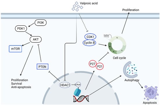 Schematic illustration of anti-cancer signaling pathways of valproic acid in cancer cells. The dotted line represents the proven pathway, but the mechanism is unknown. This figure is made by an online tool at BioRender.com (accessed on 15 June 2022).