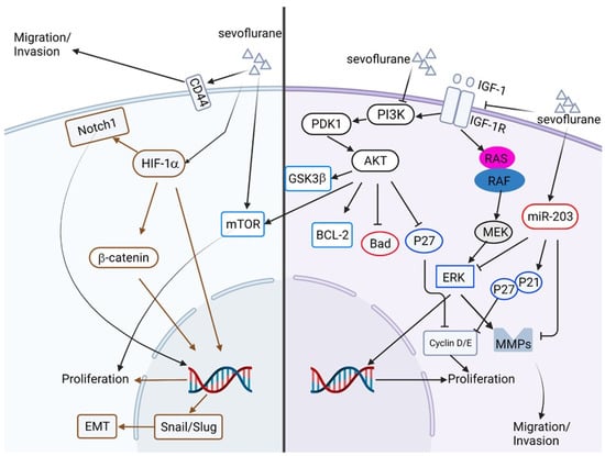 Schematic illustration of volatile anesthetics in the regulation of cancer progression. The right half represents the anti-cancer effects of sevoflurane in the treatment of various cancers. The left half represents the treatment of sevoflurane induces proliferation, migration, invasion, and EMT in certain cancers. The brown color represents the signaling pathways elicited by HIF-1α. This figure is made by an online tool at BioRender.com (accessed on 15 June 2022).