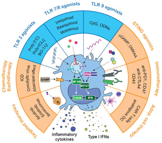 | TLR7/8 | R837 (imiquimod®) | FDA-approved for the treatment of basal cell carcinomas | Promotes apoptosis and cell-mediated antitumor immunity | [9,64,67] |