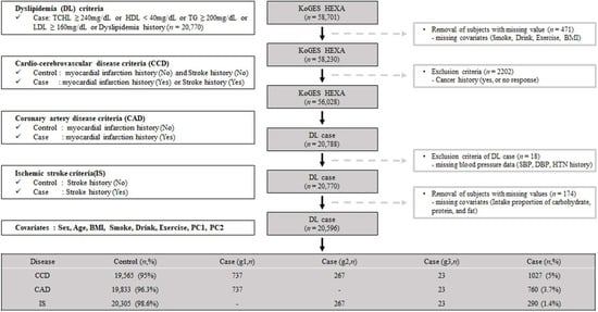 Our study used the KoGES dataset obtained from the Korean Center for Disease Control and Prevention. The cohort of KoGES was the health examination group (KoGES HEXA), and the dataset consists of the pharmacologic history, anthopomethric traits, and blood biochemistry of participants []. The detailed cohort information is described in our previous report []. Briefly, KoGES HEXA includes 58,701 participants whose genome-wide SNP data were obtained. We present the exclusion criteria as schematically illustrated in Figure 1. We excluded participants with missing values, i.e., smoking, alcohol, exercise history, and body mass index (BMI) (n = 471). Additionally, participants with a malignancy history or no response regarding malignancy were excluded (n = 2202). After those exclusions, 56,028 participants were included. Among the filtered subjects, 20,788 had dyslipidemia. Subjects without blood pressure data (n = 18) or nutrient intake data (n = 174) were excluded. The final sample size for the present analysis was 20,596, and these samples were subdivided by CCD (yes or no), CAD (yes or no), and IS (yes or no). A flowchart of the patient selection process is shown in Figure 1.
