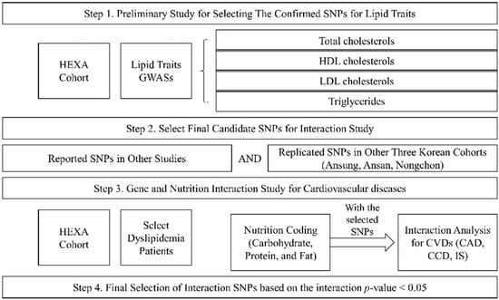 Our study was performed in four steps (Figure 2). The first step was the preliminary study to choose the SNPs for lipid traits (TCHL, HDL, LDL, and TG) using the HEXA cohort. The second step was the selection of final candidate SNPs by matching the reported SNPs and the replicated SNPs in other Korean cohorts (Ansung, Ansa, Nongchon); this involved selecting the SNPs with the same trend of association between lipid traits and other cohort SNPs (Table S1). The third step was an analysis of the genetic associations of the intake of macronutrients (carbohydrates, proteins, and fats) and CVDs in the dyslipidaemia patients of the HEXA cohort. Finally, we selected the significant SNPs based on the interactions of p-values.