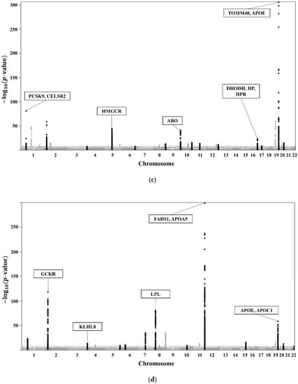 (a) Manhattan plot showing the relationships between TCHL and SNPs. (b) Manhattan plot showing the relationships between HDL and SNPs. (c) Manhattan plot showing the relationships between LDL and SNPs. (d) Manhattan plot showing the relationships between TG and SNPs.