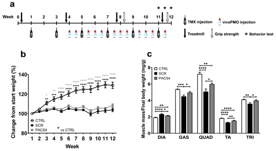 vivoPMO-PACS4 treatment improved body-wide muscle weight. (a) Diagram of the experiment, including timepoints of injections of tamoxifen (TMX) to induce DUX4 expression and vivoPMOs, and functional tests. All mice received 6 × 1.5 mg/kg/injections of TMX via intraperitoneal (IP) delivery. ACTA1-MCM/FLExDUX4 mice were further IP injected with 12 × 10 mg/kg/injections of either vivoPMO-PACS4 (PACS4, n = 6) or vivoPMO-SCR (SCR, n = 6), considered as a negative control. ACTA1-MCM mice receiving volume-matched saline were considered as a positive control (CTRL, n = 6). (b) Weekly bodyweight is shown as percentage of the initial weight recorded on the day of the first TMX injection. (c) Animals were sacrificed after 8 weeks of vivoPMO treatment. Muscle mass of the diaphragm (DIA), gastrocnemius (GAS), quadriceps (QUAD), tibialis anterior (TA) and triceps (TRI) was normalized to the corresponding final bodyweight. Data are shown as means ± SEM; n = 6. Statistical analysis was by (b) two-way or (c) one-way ANOVA followed by Tukey’s multiple comparisons test; * p < 0.05, ** p < 0.01, *** p < 0.001, **** p < 0.0001. In (b), black asterisks indicate significance between the SCR and CTRL groups; grey asterisks indicate significance between the PACS4 and CTRL groups.