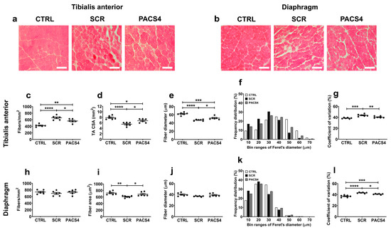 Surprisingly, in contrast to the remarkable changes observed through H&E staining, we detected only a minor decrease in both the number and the diameter of the DIA myofibers of the SCR group, compared to the CTRL and PACS4 values (Figure 4h,j). However, the area of myofibers in the SCR group’s DIA was significantly smaller than that of the CTRL group’s myofibers by 16% (p = 0.0046, Figure 4i), while the coefficient of variation increased from 36.9 ± 0.8% to 43.1 ± 0.4% (p < 0.0001, Figure 4k,l). The PACS4 treatment successfully restored the myofiber area to a normal level (p = 0.4684) and increased the coefficient of variation to 40.7 ± 0.4% compared to the SCR group (p = 0.0232). These results clearly demonstrate that the PACS4 treatment was effective in counteracting DUX4 pathology in both the TA and DIA muscles of treated ACTA-MCM/FLExDUX4 mice.
