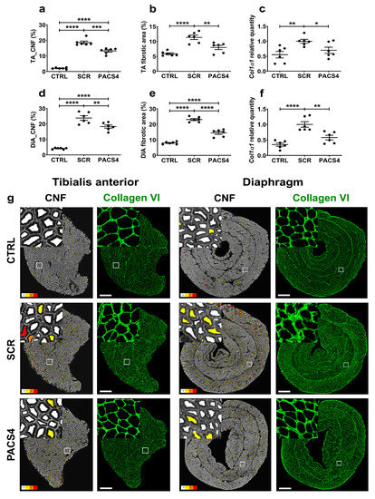 In addition to muscle deterioration, excessive muscle fibrosis negatively affects muscle function and is an important hallmark of FSHD [44]. We therefore additionally examined the level of fibrosis in TA and DIA muscles using immunostaining for a commonly used marker of fibrosis, collagen VI [45,46] (Figure 5b,e,g). Collagen VI quantification revealed that the DUX4 expression led to an increase in the fibrotic area, from 5.9 ± 0.3% (CTRL) to 11.9 ± 0.7% (SCR, p < 0.0001) in the TA and from 8.0 ± 0.3% (CTRL) to 23.1 ± 0.7% (SCR, p < 0.0001) in the DIA. The PACS4-treated TA and DIA muscles displayed 8.0 ± 0.7% and 14.5 ± 0.9% of their area covered by collagen VI, respectively, which was a remarkable decrease by up to 37% compared to the fibrosis seen in the SCR muscles (p < 0.0001). In agreement with histological analyses, the mRNA level of Col1α1, another indicator of a fibrotic response, was highly elevated in both the SCR-treated TA (p = 0.0053) and DIA (p < 0.0001), compared to the CTRL values. The PACS4 treatment efficiently reduced the Col1α1 expression to the CTRL level by 30% (p = 0.0332) and 42% (p = 0.0026) as compared to the levels seen in the SCR-treated TA and DIA, respectively (Figure 5c,f).