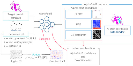 Our approach to solubility-aware protein-binding peptide design was performed using AfDesign binder hallucination. AfDesign is a public module created by Dr. Sergey Ovchinnikov [36], and it is a tool for designing protein-binding peptides based on Dr. Sergey’s previous work with trRosetta [33,50]. AlphaFold is used as the structure prediction oracle, the optimization target is the binding sequence, and the loss function is defined as a flexible function of AlphaFold confidences. It returns pLDDT, PAE, and distogram, among which pLDDT measures the quality of the local model for each residue, and PAE indicates the confidence level of each amino acid residue pair, and distogram indicates the distance prediction probability of the of an amino acid residue pair. The objective of this study was to investigate whether a new loss function with a solubility measure could be added to the original AfDesign loss function to optimize the solubility of the sequence that is designed. Binding affinity was measured using AutoDock CrankPep, which was highly rated in a benchmarking evaluation of protein-peptide docking tools [51]. and further validated by measuring logS by QikProp as a measure of solubility. A schematic diagram of the entire process is shown in Figure 1.