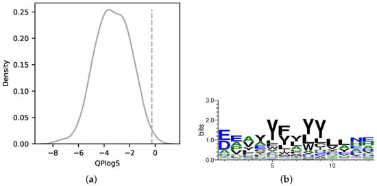 Distribution of logS of MDM2 binder sequences designed by AfDesign and sequence logo of the binder sequences. Distribution of logS calculated by QikProp. Dashed lines are logS values for the p53 peptide (a). Sequence logo for sequences designed with the AfDesign binder hallucination protocol (b). Hydrophilic amino acids (R, K, D, E, N, and Q) are shown in blue, neutral amino acids (S, G, H, T, A, and P) are shown in green, and hydrophobic amino acids (Y, V, M, C, L, F, I, and W) are shown in black.