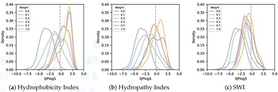 Distribution of logS for various weights of sequences designed in AfDesign using three solubility indices. The logS of sequences designed in AfDesign using the Hydrophobicity Index (a), Hydropathy Index (b), and Solubility-Weighted Index (c) as solubility indices in the loss function. Each color indicates the weight of the solubility loss. The gray line with a weight of 0.0 shows the distribution of logS for the sequence designed by AfDesign without a solubility index. The dashed line shows the logS of the p53 peptide.