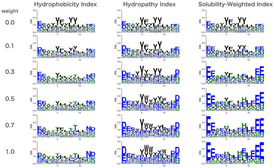 The sequence with the lowest final loss in AfDesign in the latter 10 iterations (hard_iter) design_3stage() was selected as the best sequence. Sequence logos were created on the WebLogo 3 server (http://weblogo.threeplusone.com/create.cgi (accessed on 26 April 2022)) [47] with the 100 best sequences per solubility index and per weight as input.
