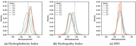 Distribution of binding affinity for various weights of sequences designed in AfDesign using three solubility indices. The binding affinity of sequences designed in AfDesign using the Hydrophobicity Index (a), Hydropathy Index (b), and Solubility-Weighted Index (SWI) (c) as solubility indices in the loss function. Each color indicates the weight of the solubility loss. The gray line with a weight of 0.0 shows the distribution of binding affinity for the sequence designed by AfDesign without a solubility index. The dashed line shows the average of binding affinity of the p53 peptide.