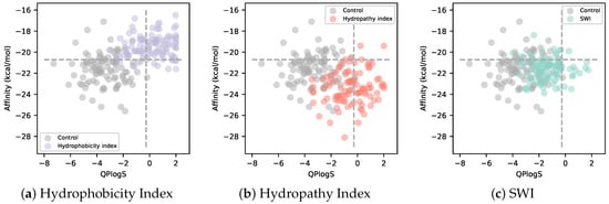 Scatter plots of binding affinity and logS for various weights of sequences designed in AfDesign using three solubility indices. Each point shows the binding affinity and logS of a sequence designed in AfDesign with a weight of 0.5 using the Hydrophobicity Index (a), Hydropathy Index (b), and Solubility-Weighted Index (SWI) (c) as solubility indices in the loss function. Gray dots show the binding affinity and logS of sequences designed in AfDesign without a solubility index. The horizontal dashed line shows the average binding affinity of the p53 peptide. The vertical dashed line shows the logS values for the p53 peptide.