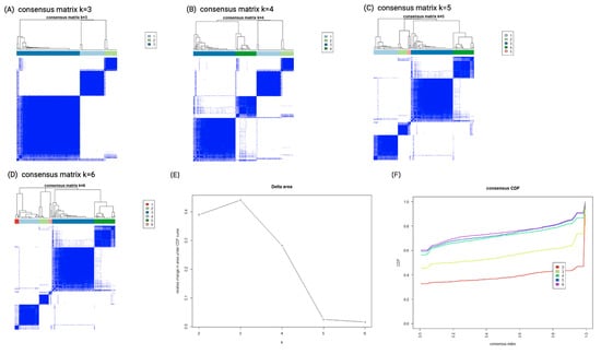 Consensus clustering analysis results displaying the robustness of sample classification using multiple iterations of k-means clustering. (A–D) The consensus matrix heat maps of K = 3, 4, 5 to K = 6 using 45 baseline parameters. The dark blue color shows the consensus of which groups fit perfectly together, and the white color shows that two individuals are always grouped separately. (E) Curve of CDF. (F) CDF delta area curve of consensus clustering. The x axis represents the category k, and the y axis denotes the relative change in area under the CDF curve of category k compared with category k − 1. Abbreviations: CDF, cumulative distribution function.