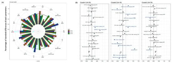 (A) Circular barplots of the selected predictors associated with each cluster. The height of each bar represents each percentage of standard difference to total standard difference response of each characteristic. (B) Three clusters based on 18 parameters. Manhattan plot of the standardized differences across three AKI subgroups of the selected baseline predictors. The x axis is the standardized difference value, and the y axis represents the four time serial baseline parameters. The dashed-dotted vertical lines represent standardized difference cutoffs of >0.3 or <−0.3. The light blue horizontal lines sort the category to which the predictors belong, including T1 (baseline), T2 (before initiating RRT), T3 (at the time of stopping RRT) and T4 (24 h after weaning off RRT). Abbreviations: AKI, acute kidney injury; BUN, blood urea nitrogen; Cr, creatinine; eGFR, estimated glomerular filtration rate; NGAL, neutrophil gelatinase-associated lipocalin; RRT, renal replacement therapy; sCr, serum creatinine; SOFA, Sequential Organ Failure Assessment; UO, urine output.