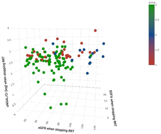 3D scatter plot of patients with colors representing clustering by eGFR, SOFA score and uNGAL/Cr (log) at the time of weaning off RRT. Abbreviations: Cr, creatinine; eGFR, estimated glomerular filtration rate; RRT, renal replacement therapy; SOFA, Sequential Organ Failure Assessment; uNGAL, urinary neutrophil gelatinase-associated lipocalin.