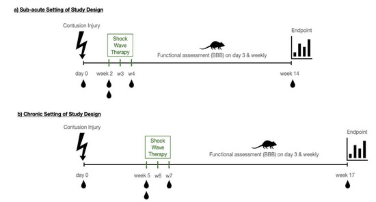Based on available literature [16,34,35], as well as our own preliminary data, animals randomly assigned to a therapy group received 500 impulses of focused low-energy shockwaves using an electro-hydraulic shockwave device (OrthoGold 100, MTS Medical UG, Konstanz, Germany) with an energy flux density of 0.1 mJ/mm2 and a frequency of 5 Hz (Focused shockwave applicator: OE50) onto the area of surgery at the 11th thoracic vertebra. Figure 1 depicts the therapeutic settings and indicated timepoints at which shockwaves were applied. In the subacute setting, therapeutic intervention was conducted in week 2, week 3 and week 4 after injury, while in the chronic setting, shockwaves were applied in week 5, week 6 and week 7 after contusion. Control group animals did not receive shockwave intervention, which was the only distinction from the treatment group animals. The observation time was chosen to include 10 weeks after the last treatment session. For each treatment, animals were introduced to a short general anesthesia using 3% isoflurane gas/air mix. The area of the laminectomy was then identified transcutaneously, and ultrasound gel was applied to the area. The shockwave applicator was then placed directly above the laminectomy site for treatment of the injured spinal cord.