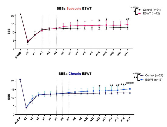 BBB-Scores (Basso, Beattie and Bresnahan locomotor score) of subacute (a) and chronic (b) ESWT (extracorporeal shockwave therapy) settings. In (a), the mean BBB-Scores of the subacute ESWT group (red) are compared to the control group (black). In (b), the mean BBB-Scores of the chronic ESWT group (blue) are compared to the control group. On the x-axis, time is plotted against the y-axis with the respective BBB-Score. Error bars indicate standard deviation. RM 2-way ANOVA was performed, and significant differences between groups are indicated by an asterisk (values with p < 0.05 are summarized as a single asterisk “★”, p < 0.01 as ”★★”, p < 0.001 as ” ★★★”, p < 0.0001 as ”★★★★”). The p-value for the treatment effect is shown in the top right for each experimental setting.