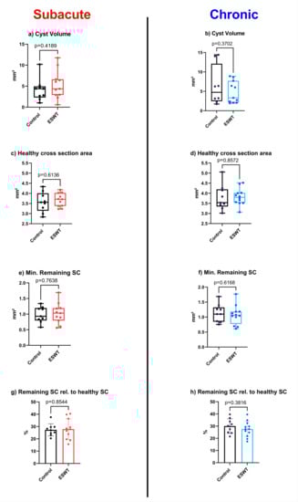 Calculated parameters generated by µCT-Scans. Various parameters were calculated using an algorithm to explore the potential morphological effects of therapeutic intervention in a subacute ((a,c,e,g), ESWT group in red and controls in black) as well as chronic ((b,d,f,h), ESWT group in blue and controls in black) setting. The cystic volume (a,b) was determined in clear distinction from a syrinx. Healthy cross-sectional area (c,d) was determined distal to the spinal cord defect site, while the minimal remaining spinal cord (e,f) was measured as a plane at the maximal diameter of the cystic cavity. Remaining spinal cord relative to healthy spinal cord (g,h) was calculated in comparison to the healthy cross section. Cystic volume = total volume of cyst from 5 mm caudal to 5 mm rostral of the defect. Healthy cross section area = average cross-sectional area at a distance of 5–10 mm rostral and caudal of the lesion area of a linear regression of healthy tissue outside the defect area to estimate the healthy cross-sectional area. Minimal remaining spinal cord = smallest remaining cross-sectional area of healthy spinal cord tissue. Remaining spinal cord relative to healthy spinal cord = smallest remaining cross-sectional area of healthy spinal cord tissue as a percentage of the healthy reference.