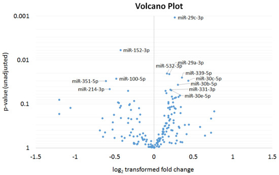 MicroRNA screening. Results of a pairwise comparison of circulating microRNA levels before and after shockwave treatment. Volcano plot shows the relationship between the log2 fold change in 187 microRNAs between treated and untreated animals. All miRNAs with p < 0.05 are labeled. Statistical differences were calculated using a paired two-sided t-test.